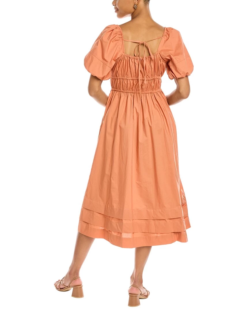 - Tailored Dress In Orange With Pleated Puff Shoulders, Layered Skirt, And Gathered Waist
