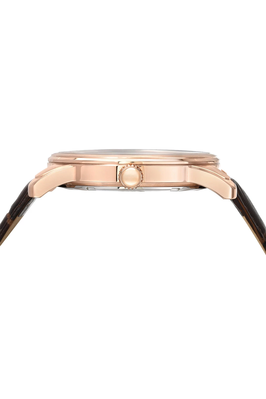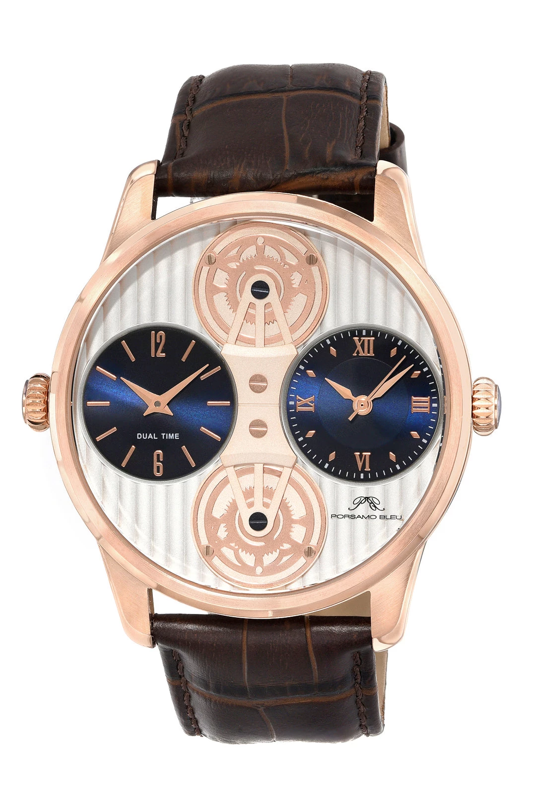 Porsamo Bleu Benedict Men’S Double Movement Watch With Stainless Steel Case And Genuine Leather Band; Silver Tone Guilloche Dial With Blue Subdials; Rose Tone & Brown