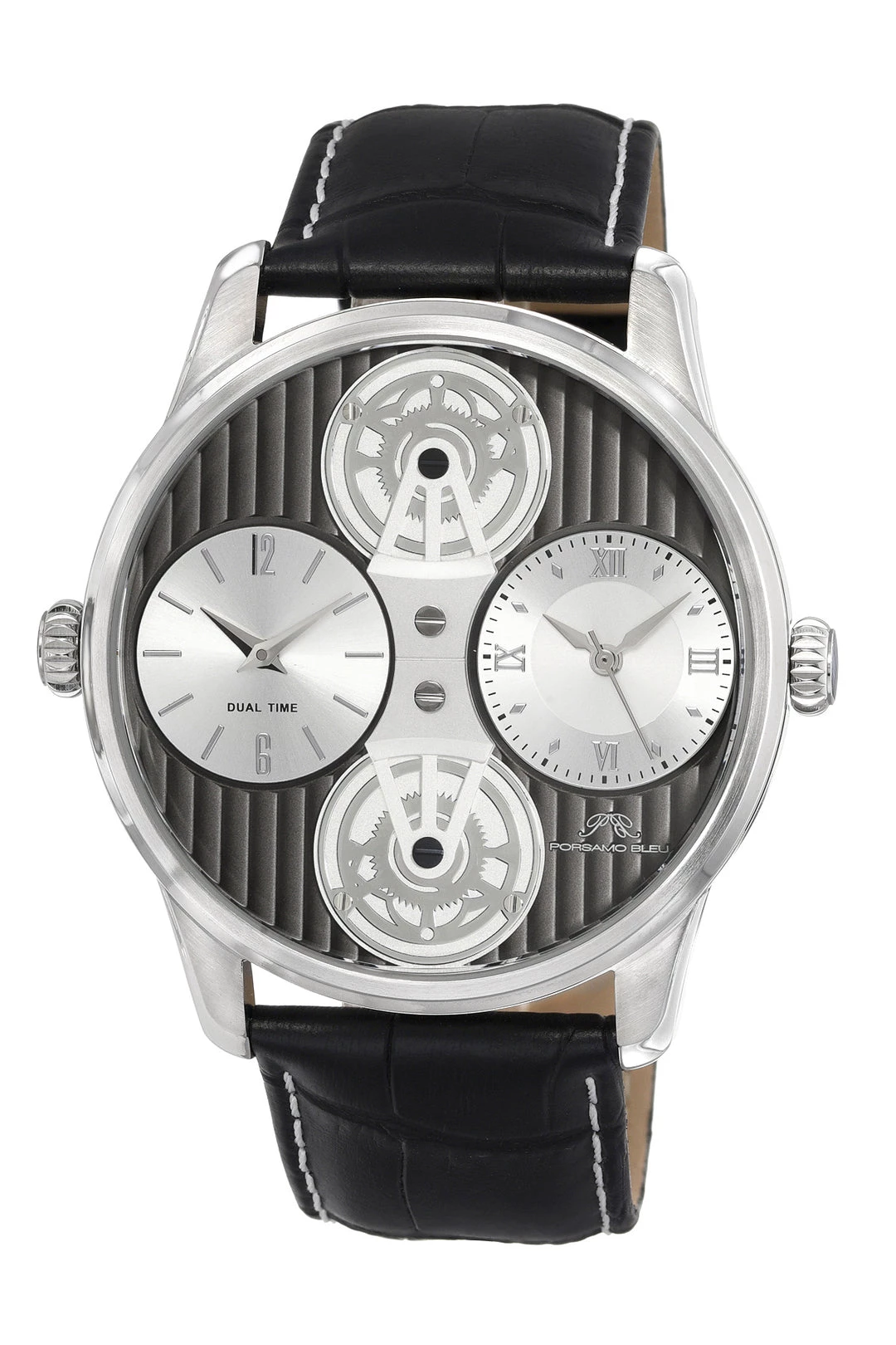 Porsamo Bleu Benedict Men’S Double Movement Watch With Stainless Steel Case And Genuine Leather Band; Grey Guilloche Dial With Silver Subdials; Silver Tone & Grey
