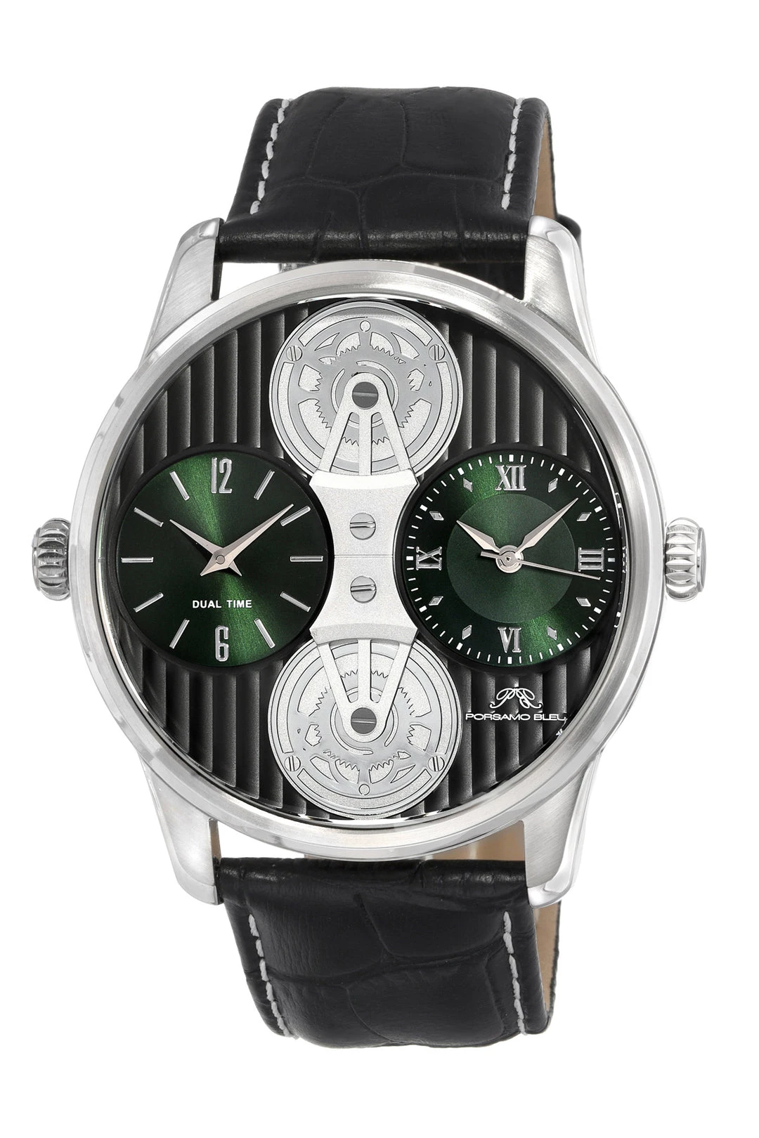 Porsamo Bleu Benedict Men’S Double Movement Watch With Stainless Steel Case And Genuine Leather Band; Black Guilloche Dial With Green Subdials; Silver Tone, Black & Green