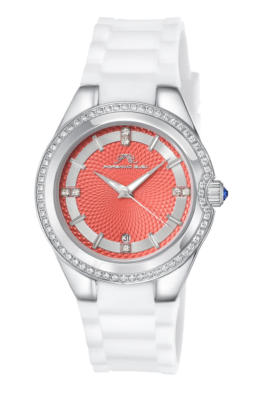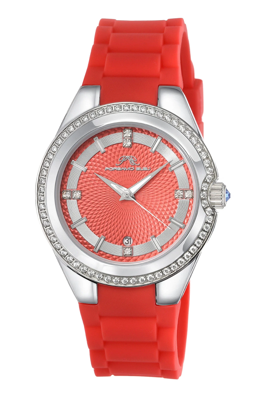 Porsamo Bleu Guilia Ladies’ Watch With Stainless Steel Case; Red Guilloche Dial; Interchangeable Red And White Silicone Straps; Silver Tone; White And Red
