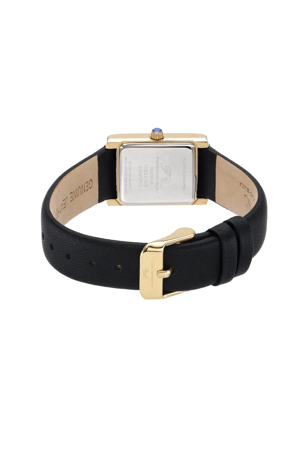 Porsamo Bleu Karolina Ladies’ Rectangular Watch With Diamond Hour Markers; Stainless Steel Case And Genuine Leather Band, Gold Tone & Black