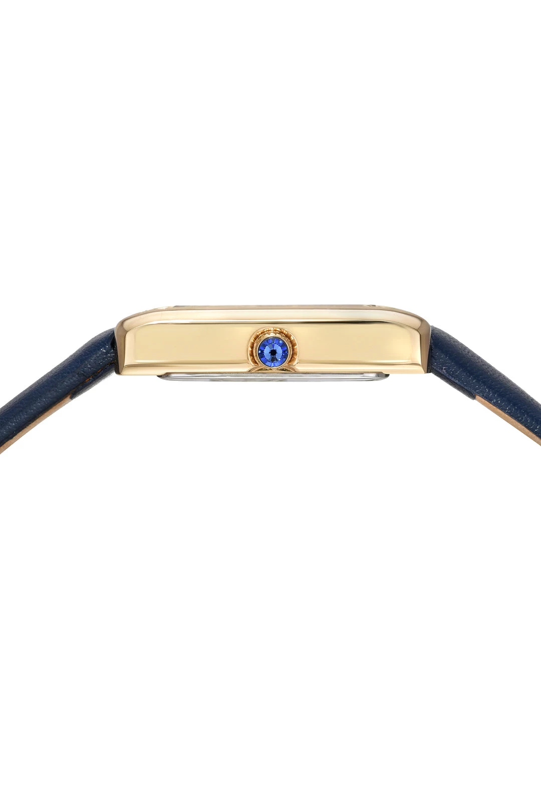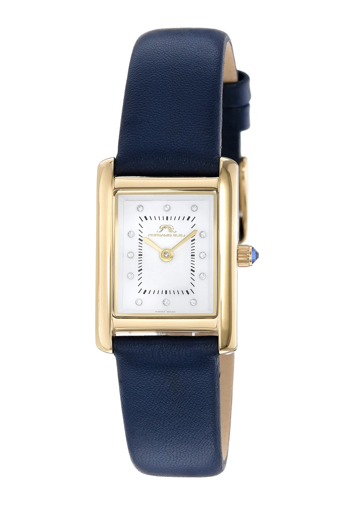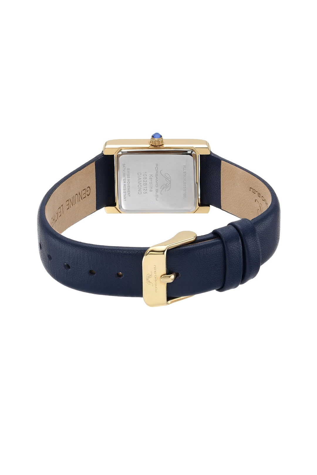 Porsamo Bleu Karolina Ladies’ Rectangular Watch With Diamond Hour Markers; Stainless Steel Case And Genuine Leather Band, Gold Tone & Blue