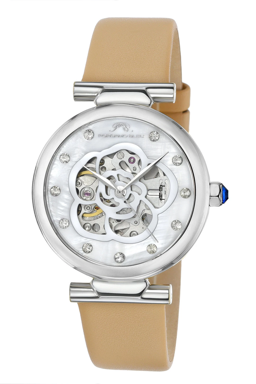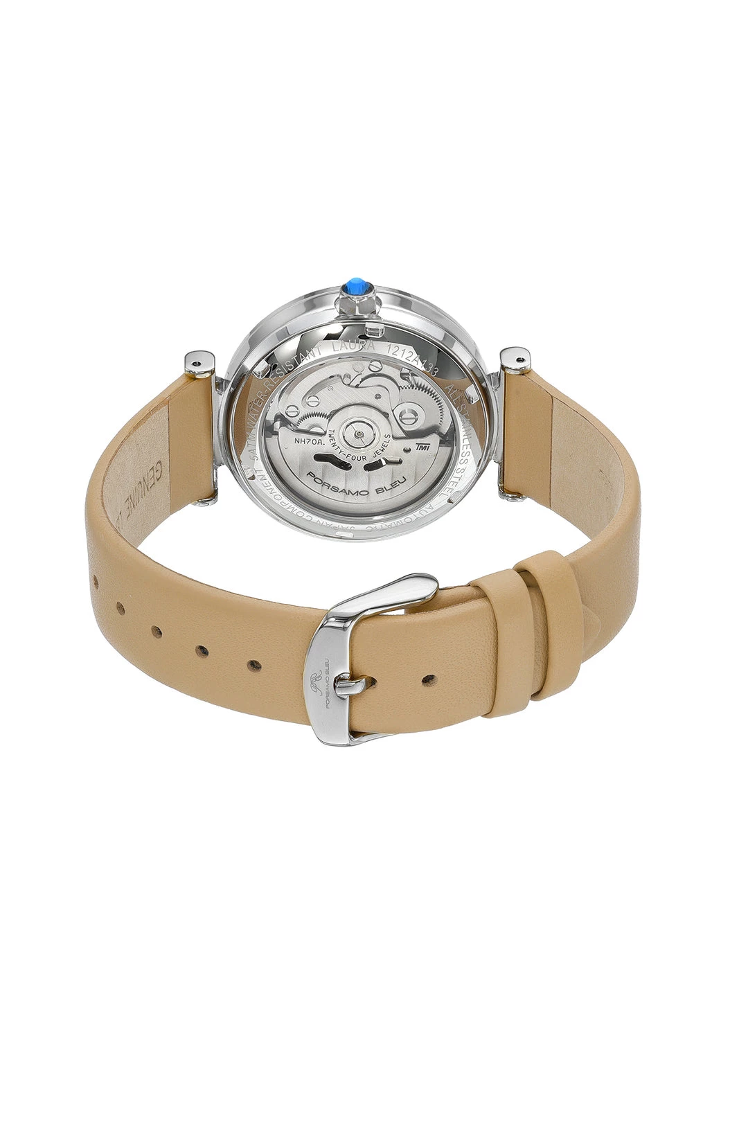 Porsamo Bleu Laura Ladies’ Automatic Watch With Stainless Steel Case And Genuine Leather Black Strap; With Topaz Hour Markers; Mother Of Pearl Skeleton White Dial; Silver Tone & Beige