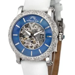 Porsamo Bleu Liza Ladies’ Watch With Stainless Steel Case And White Satin Covered Genuine Leather Strap; Two Layer Skeleton & Mother Of Pearl Dial With White Topaz Gemstones; Silver Tone And White