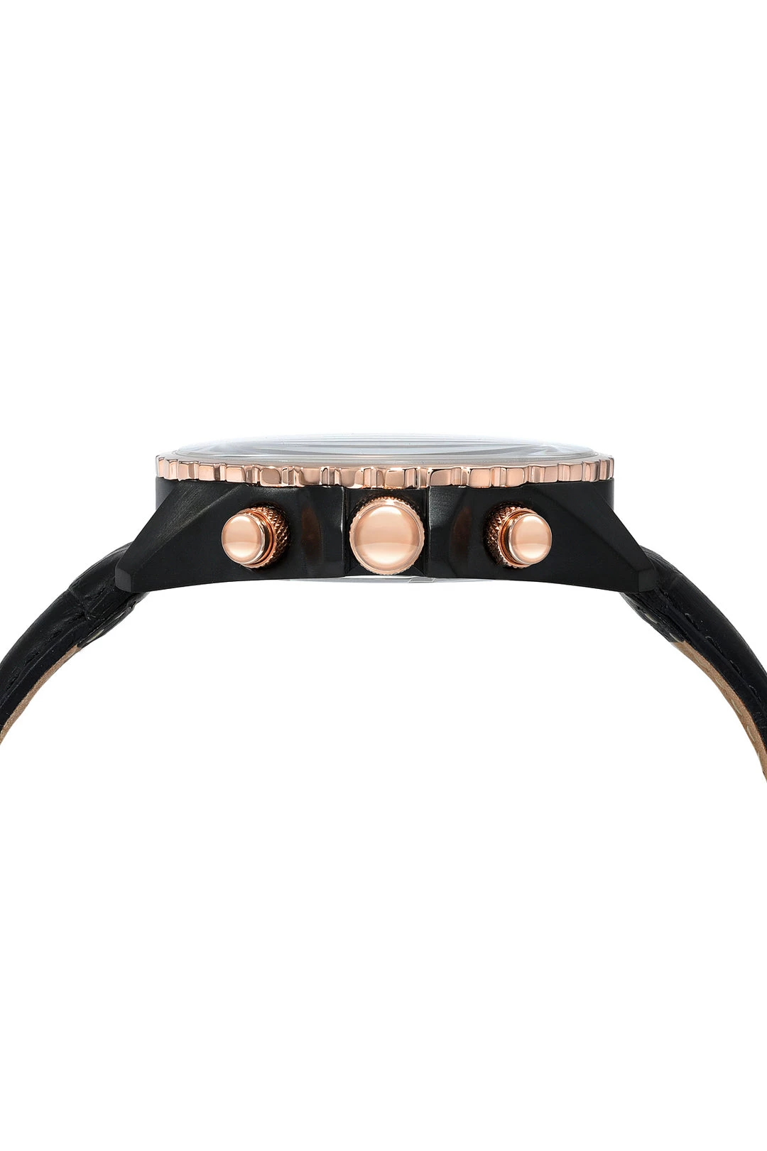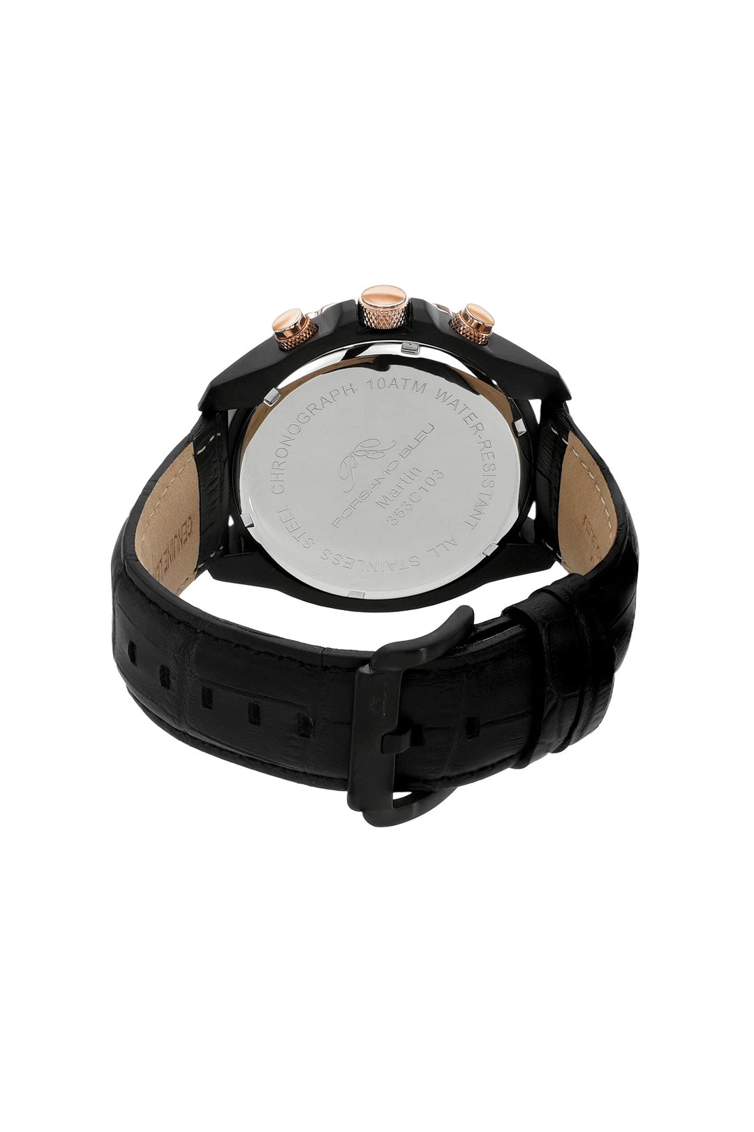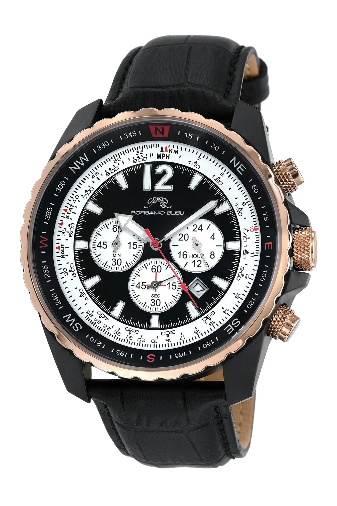 Porsamo Bleu Martin Men’s Chronograph Tachymeter Watch with stainless steel case and genuine leather strap, date window between 4 and 5 o’clock; Rose tone, black & white
