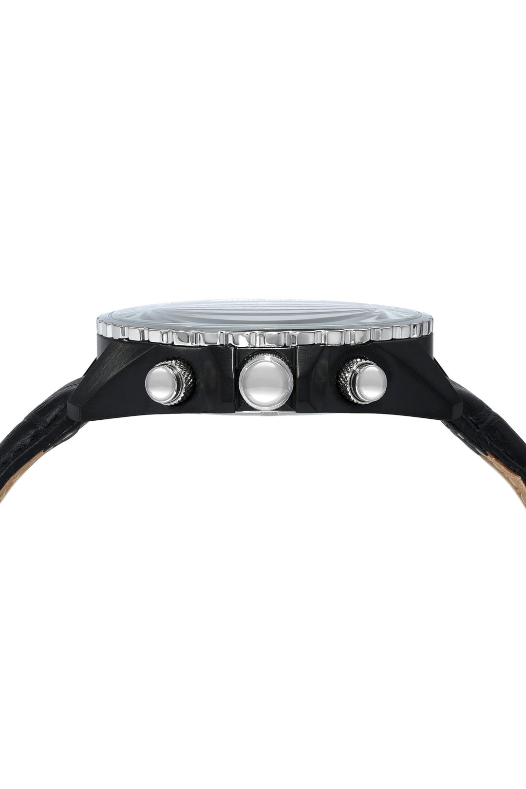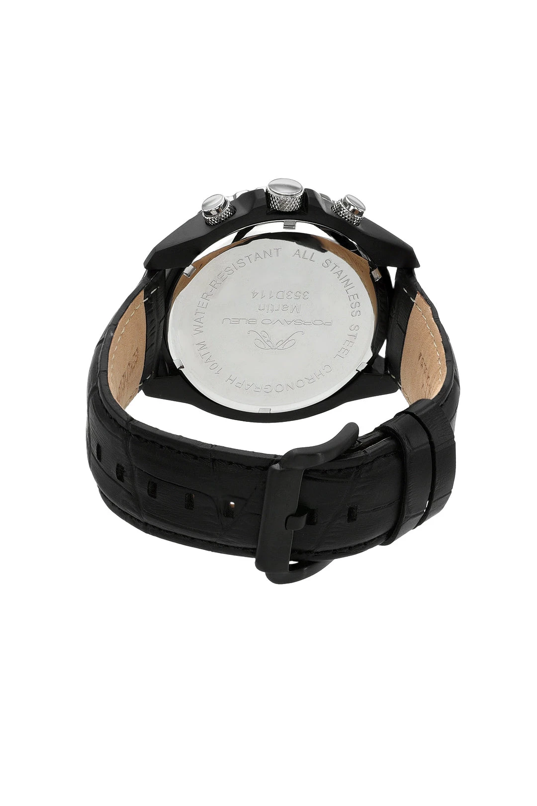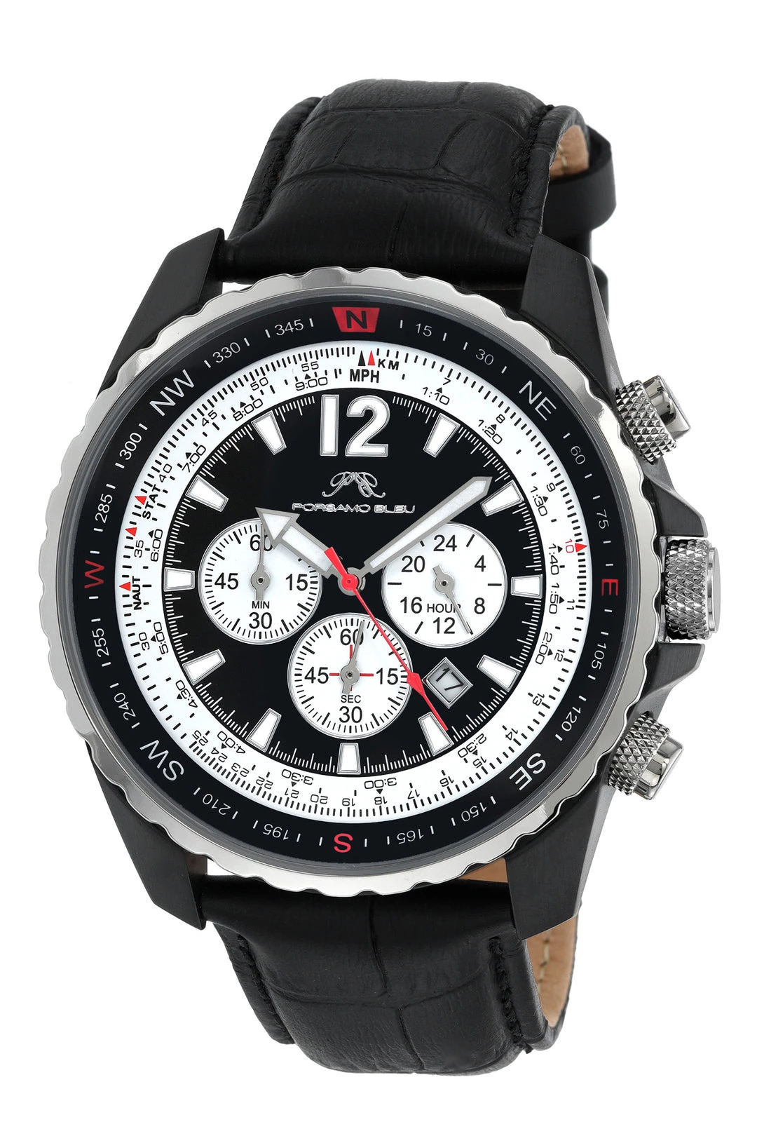 Porsamo Bleu Martin Men’s Chronograph Tachymeter Watch with stainless steel case and genuine leather strap, date window between 4 and 5 o’clock; Silver tone, black & white