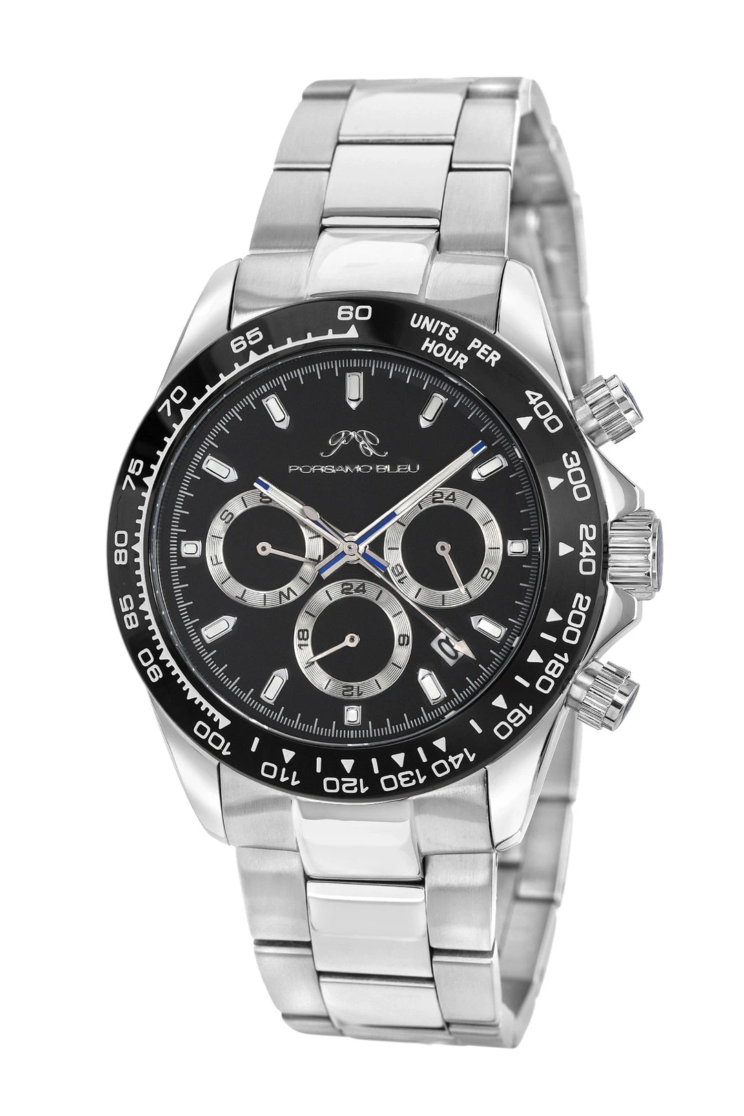 Porsamo Bleu Preston Men’S Multifunction Watch With Stainless Steel Case And Bracelet; Date Window Between 4 And 5 O’Clock; Silver Tone & Black