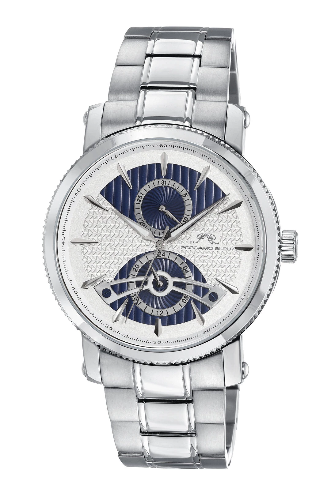 Porsamo Bleu Russel Men’S Multi-Function Watch With Stainless Steel Case And Bracelet; Blue And Silver Guilloche Dial; Silver Tone & Blue
