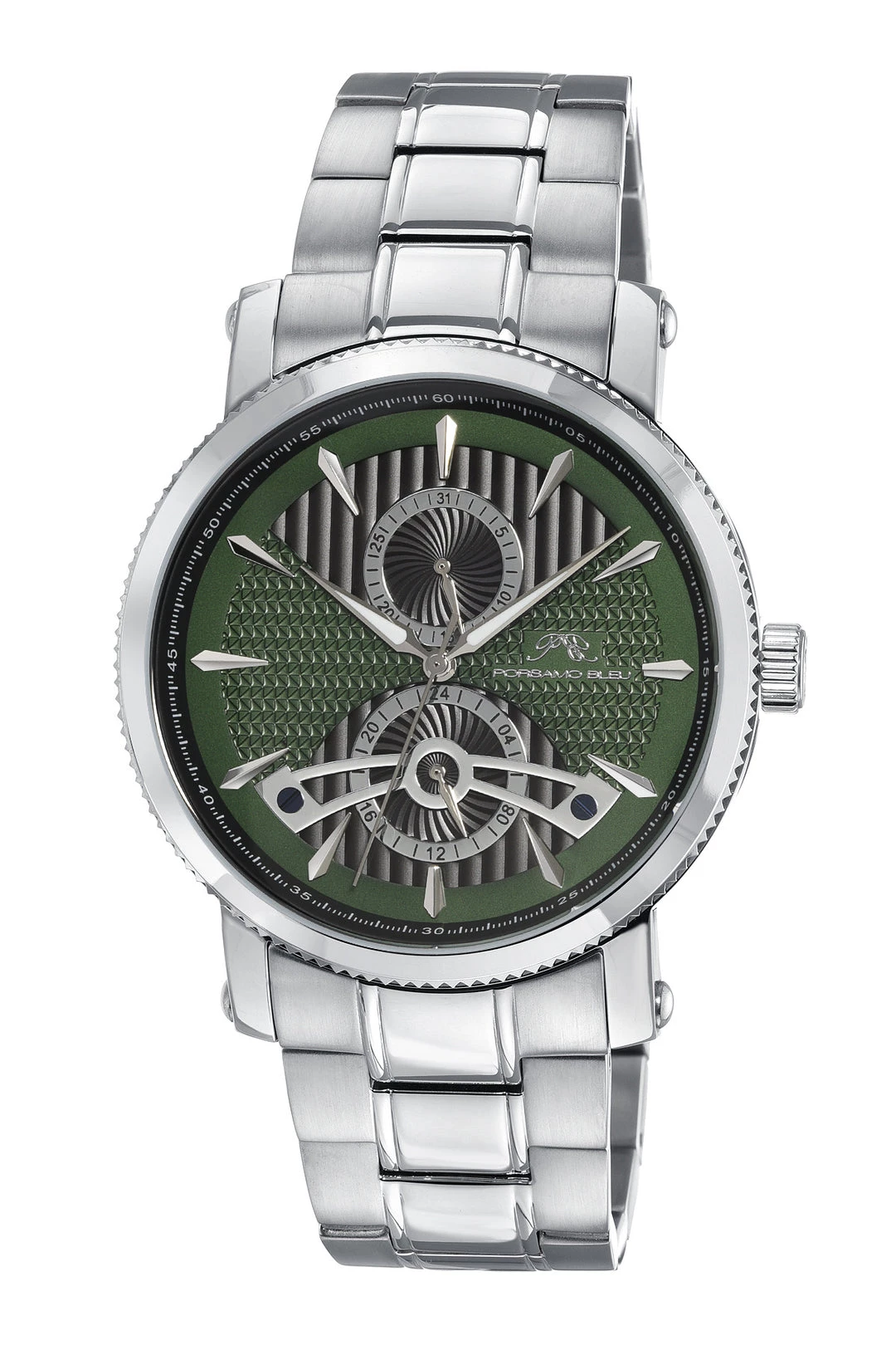 Porsamo Bleu Russel Men’S Multi-Function Watch With Stainless Steel Case And Bracelet; Black And Green Guilloche Dial; Silver Tone, Green & Black