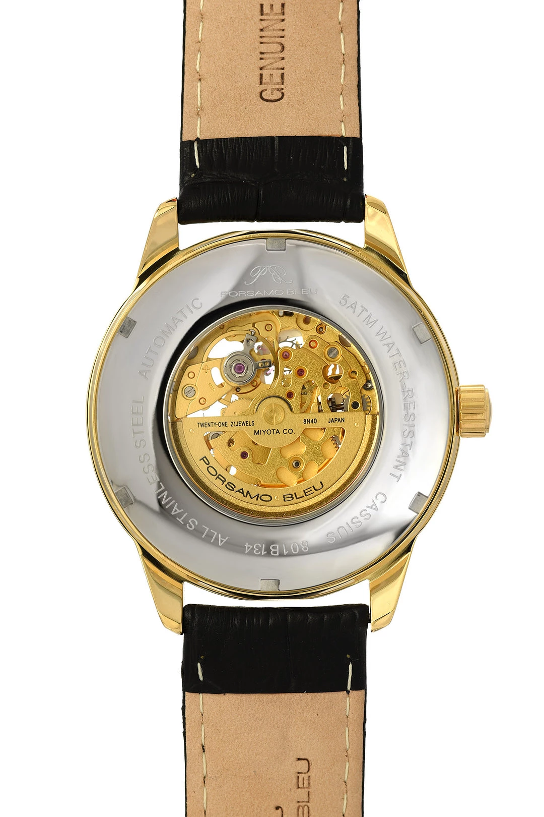 Porsamo Bleu Cassius Men’s Automatic Watch With Stainless Steel Case And Black Genuine Leather Band; Two Layer Skeleton Dial; Gold Tone And Black