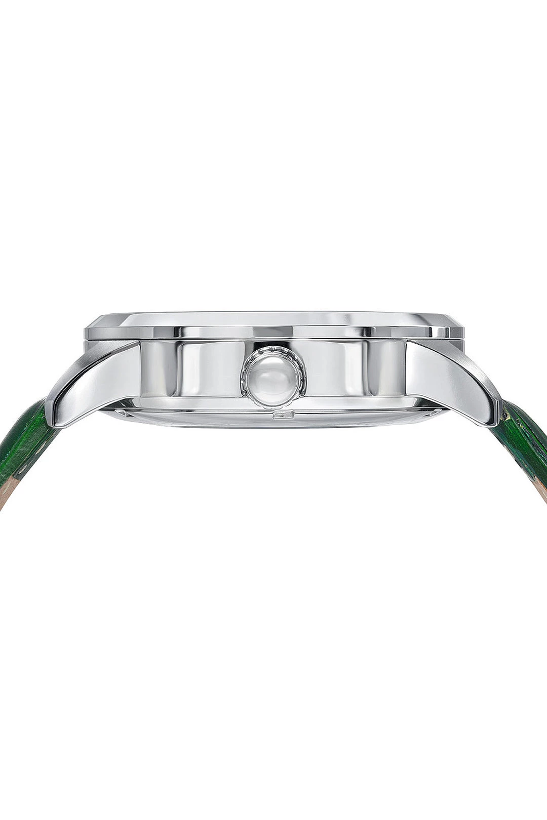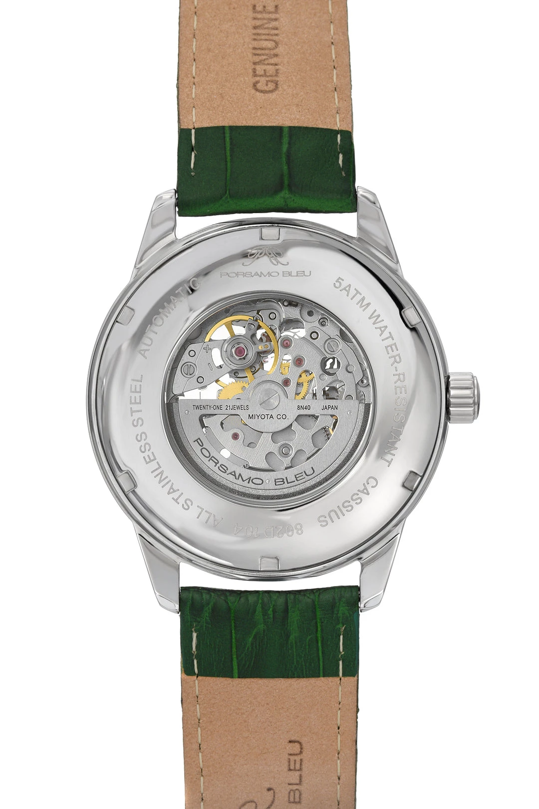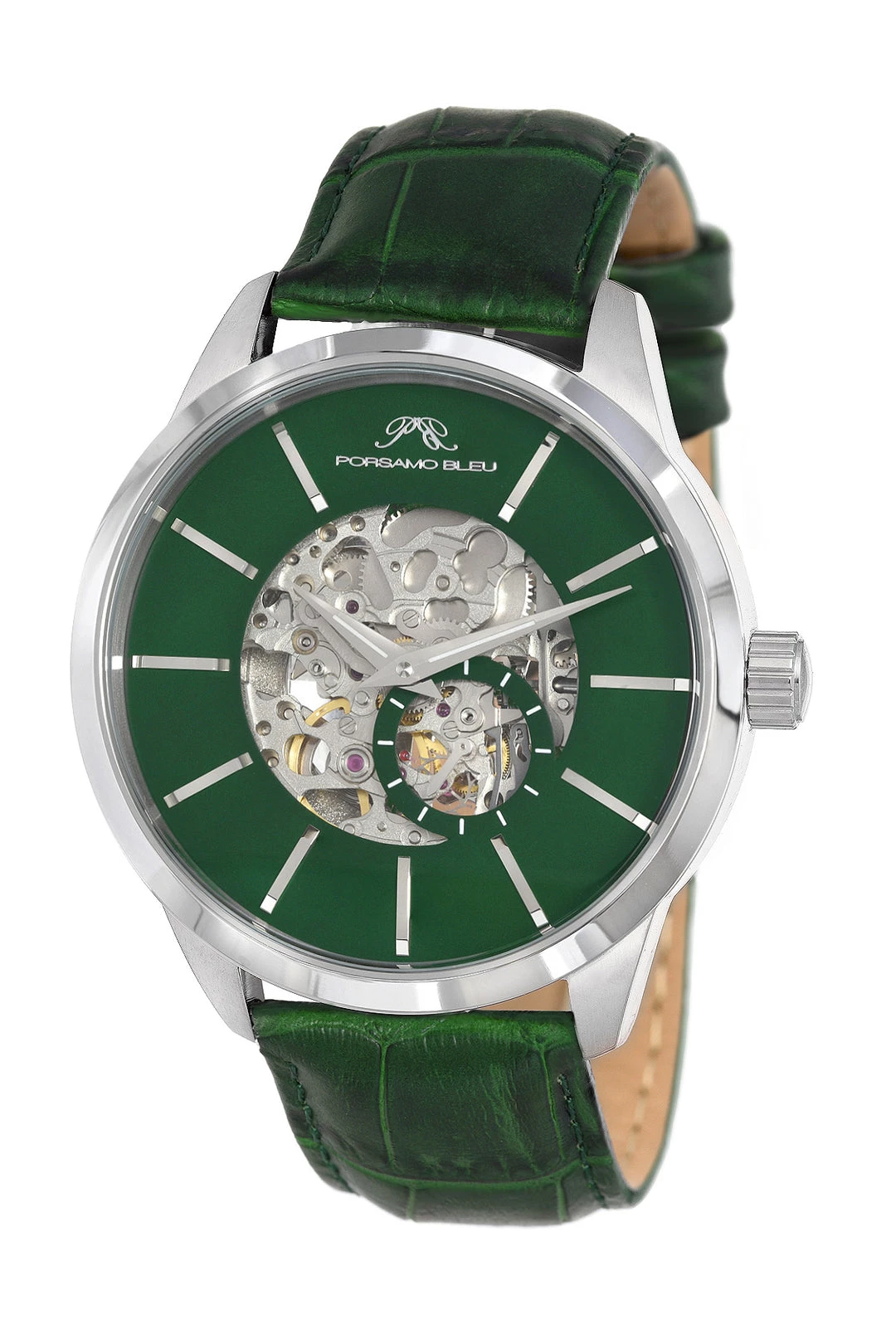 Porsamo Bleu Cassius Men’s Automatic Watch With Stainless Steel Case And Green Genuine Leather Band; Two Layer Skeleton Dial; Silver Tone And Green