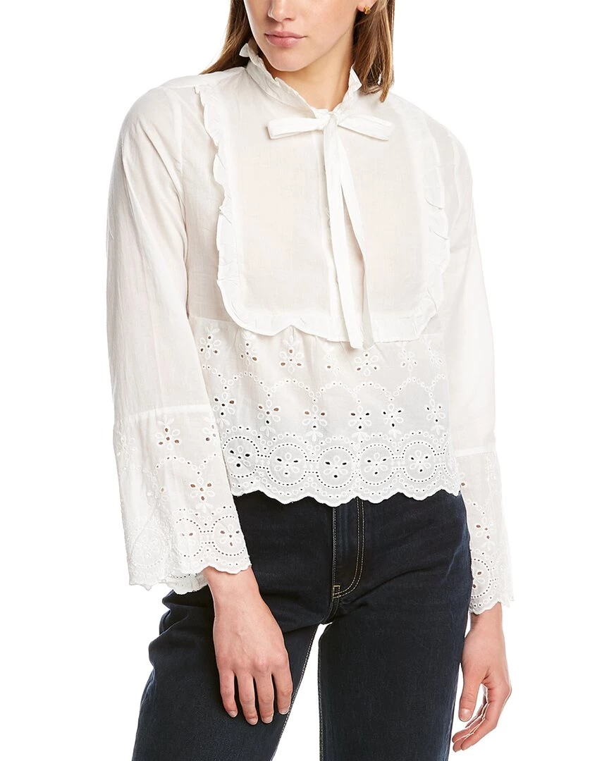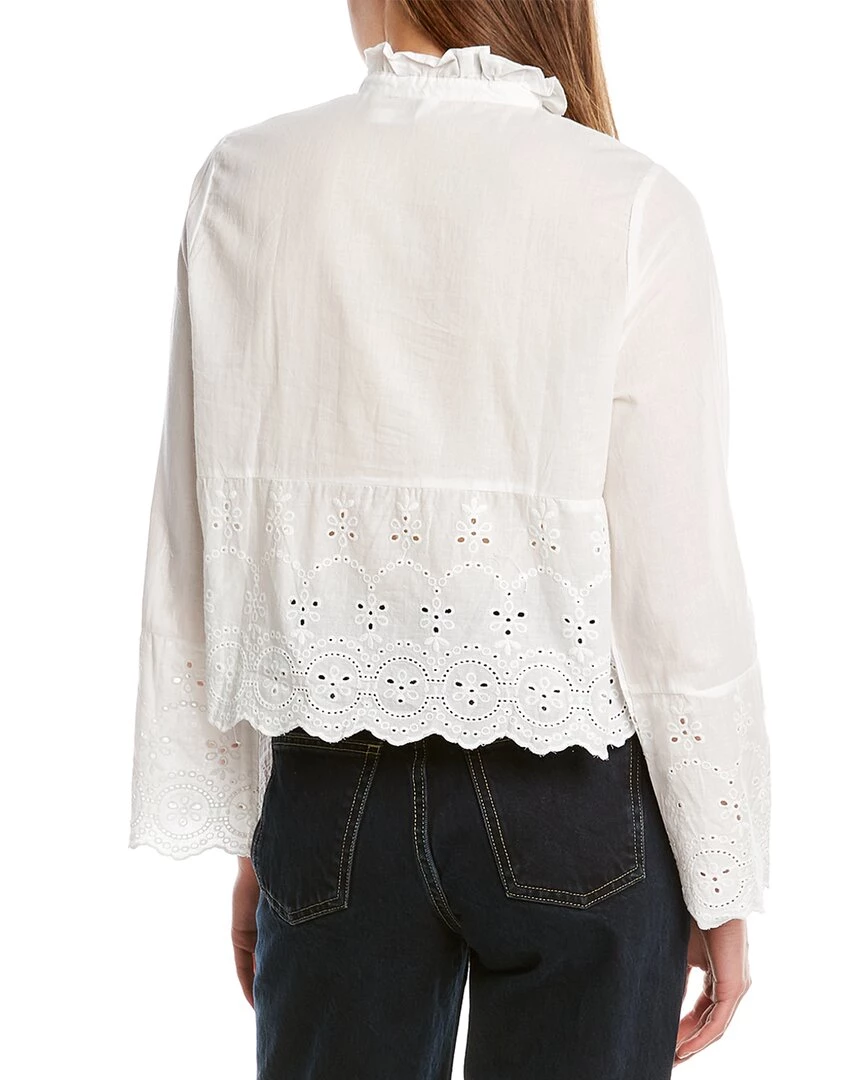 - Design Details – Self-Tie Ruffled Mock Collar, Eyelet Hem, And Scalloped Trim